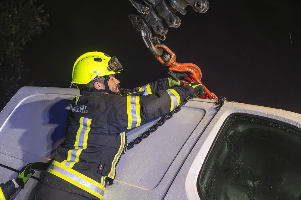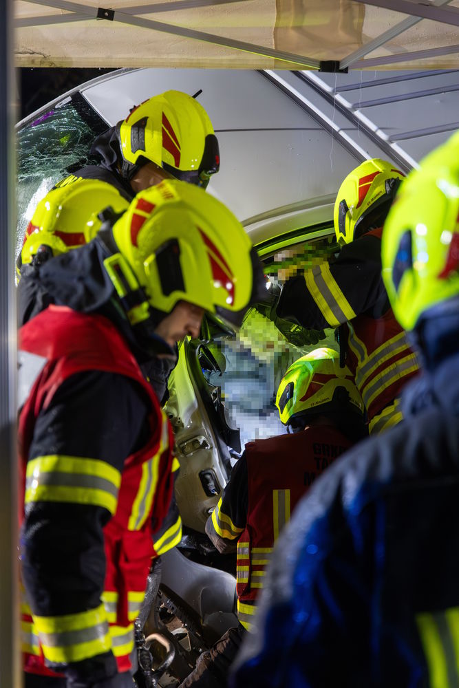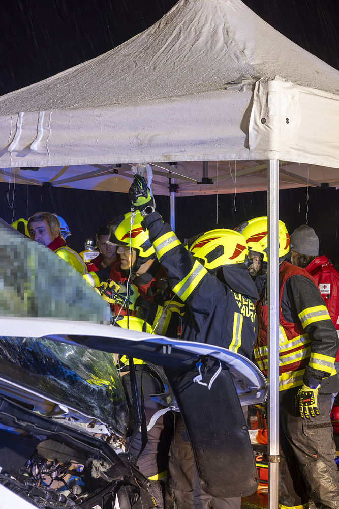 In Abstimmung mit der Rettung konnte mit der Befreiung des Patienten aus dem Kastenwagen begonnen werden. Mittels hydraulischem Rettungsgerät (Spreizer und Schere) wurde die Türe entfernt und so ein Zugang geschaffen. Mit Hilfe von einem Spineboard retteten die Einsatzkräfte von Rettung und Feuerwehr den Patienten aus dem Wrack. Auch die Person aus dem zweiten Fahrzeug wurde koordiniert mit einem Spineboard gerettet.