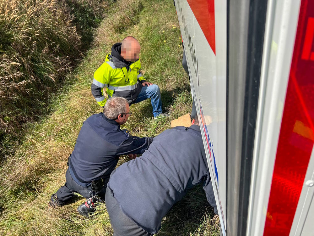 Mit dem neuen Ansatz, den LKW von der Vorderseite aus dem Graben zu holen, musste der Kran zunächst über die Umleitungsstrecke auf die andere Seite fahren. Wenige Handgriffe später konnte das Fahrzeug schließlich erneut mit der Seilwinde geborgen werden.