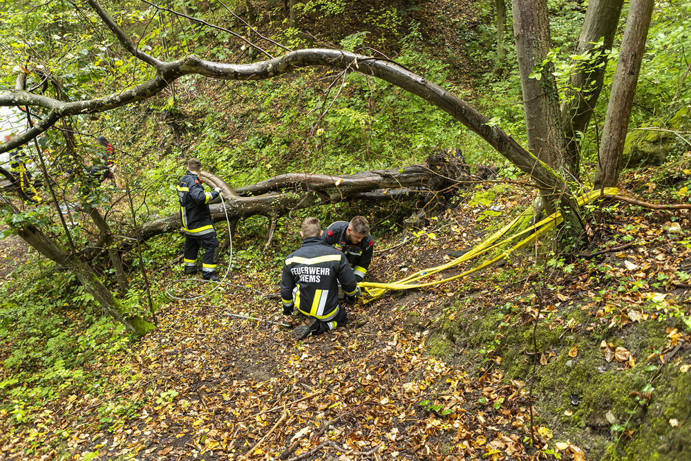 Die Einsatzkräfte der Freiwilligen Feuerwehr Krems rückten rasch mit zwei Fahrzeugen aus. Aufgrund der engen und unübersichtlichen Gegebenheiten des Forstweges wartete das größere Einsatzfahrzeug in der Mühlgasse, während die Besatzung des Last 6 Krems – einem kleinen, wendigen Allradfahrzeug – zur Erkundung vorfuhr.