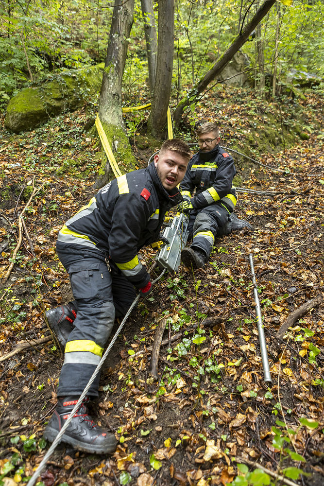 Nach einer Lagebeurteilung entschieden sich die Einsatzkräfte für eine Bergung mittels Greifzug und Seilwinde. Das notwendige Material für den Greifzug musste mühsam am verunfallten Transporter vorbeigeschafft werden.