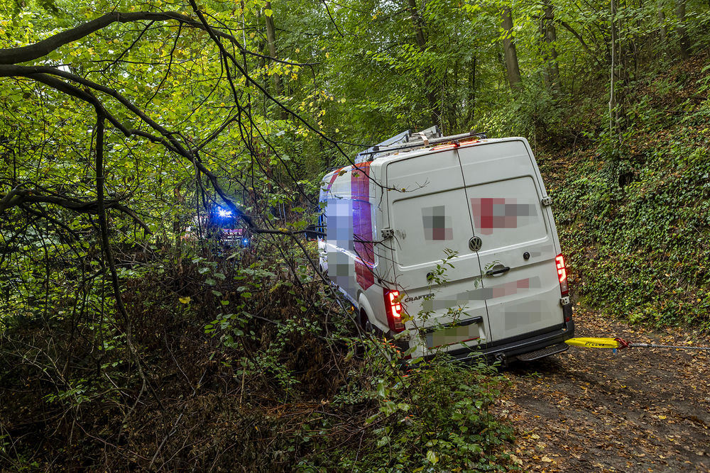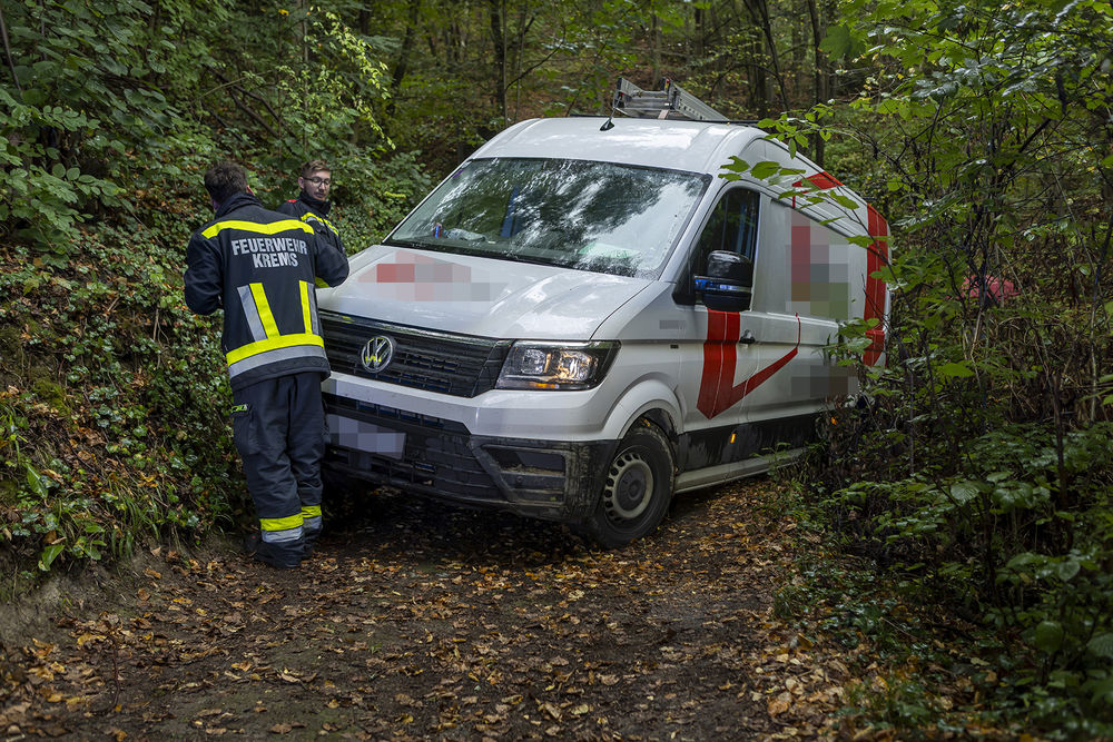 Zu einem nicht alltäglichen Einsatz musste die Freiwillige Feuerwehr Krems am Vormittag des 24. September 2025 in den Kremser Ortsteil Rehberg ausrücken. Ein Transporter war auf einem schmalen Forstweg in einer Kurve von der Straße abgekommen und mit dem linken Hinterrad abgerutscht.