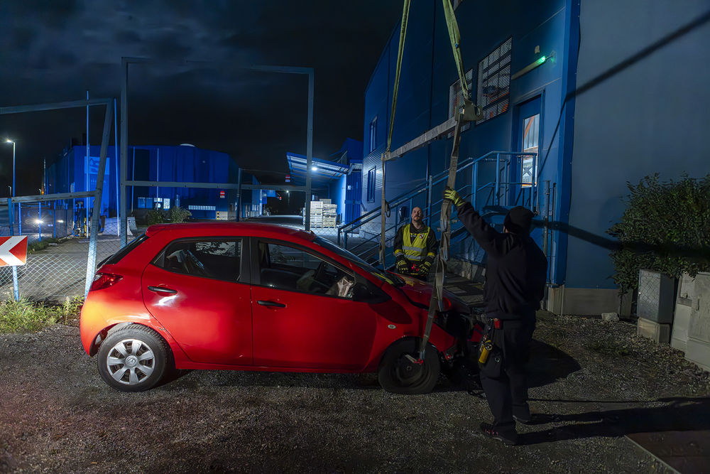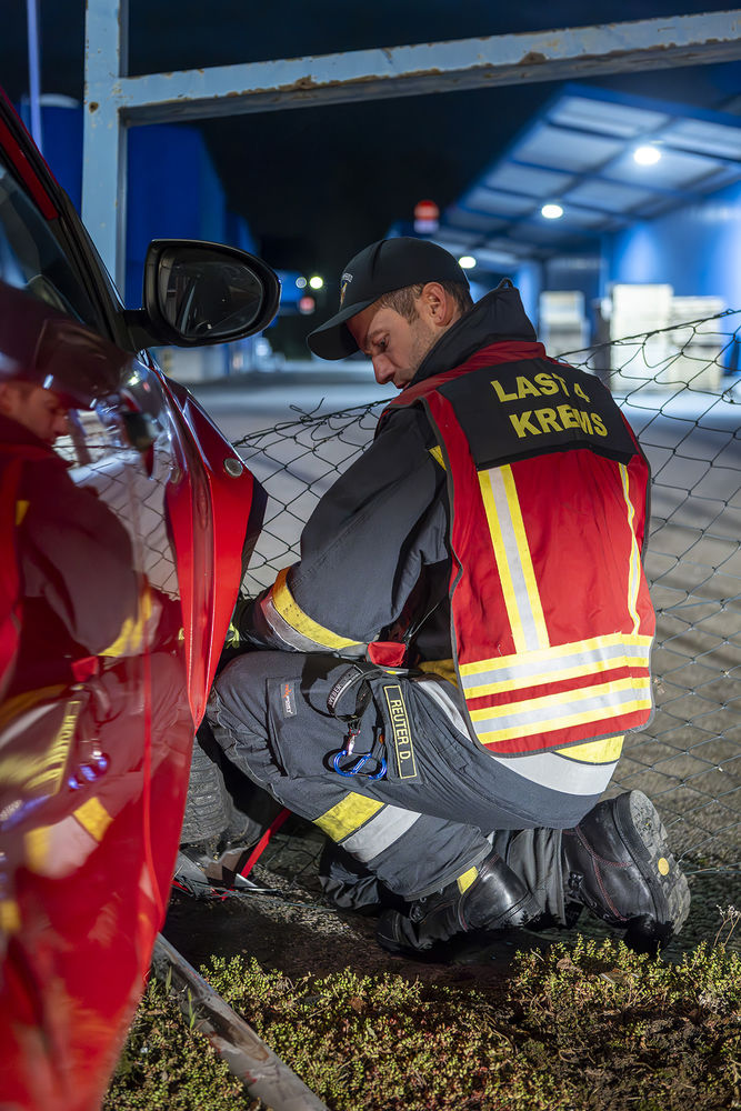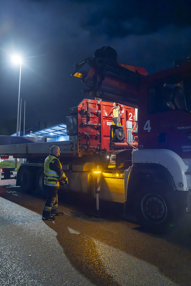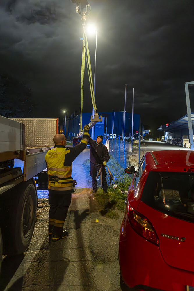 Da sich noch Hausmannschaft im Feuerwehrhaus befand, rückte diese unverzüglich mit dem Wechselladefahrzeug mit Kran zum Einsatzort aus. Nach dem Eintreffen vor Ort konnte rasch mit der Bergung begonnen werden. Da die Firma Stiefler auch zum Einsatzgebiet der Betriebsfeuerwehr Krems-Chem gehört, rückte diese ebenfalls aus und unterstützte bei der Fahrzeugbergung. Mithilfe des Krans konnte das Fahrzeug an der Vorderachse angehoben und zur Seite gerollt werden.