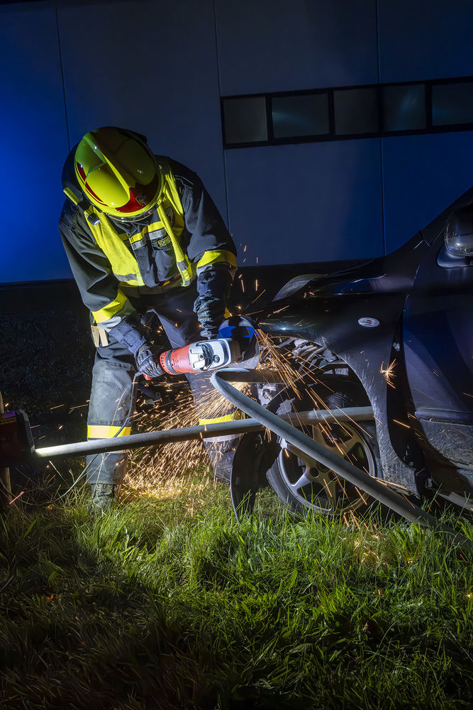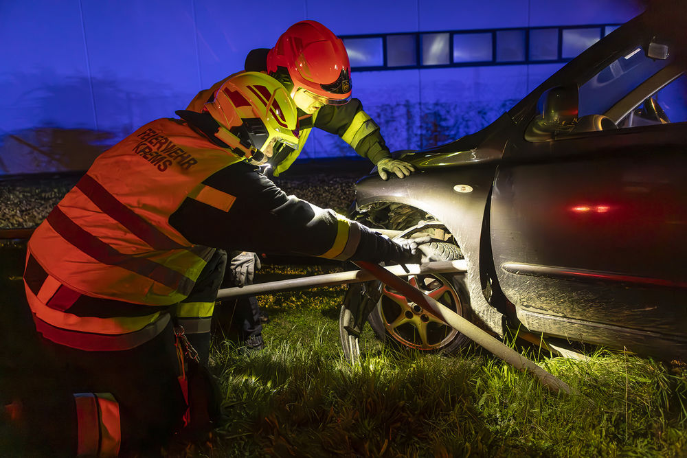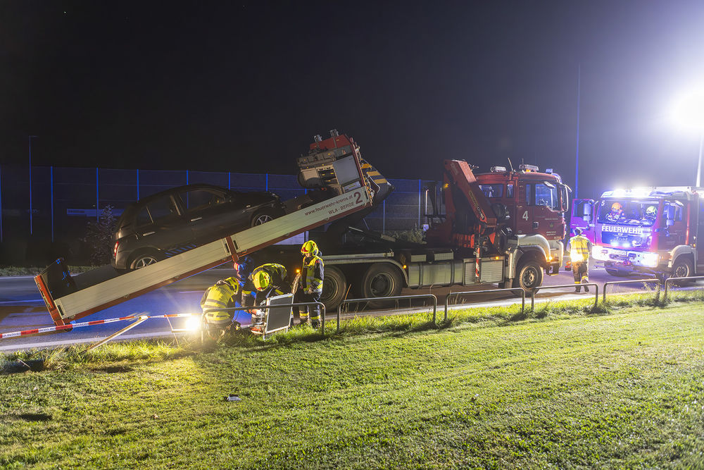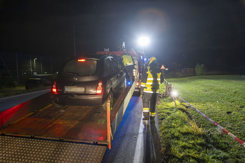Auf Anordnung der Polizei sollte das Fahrzeug gesichert abgestellt werden. Zuerst galt es, mittels Winkelschleifer die Metallelemente zu entfernen und anschließend wurde der PKW mit dem Wechselladefahrzeug abtransportiert.