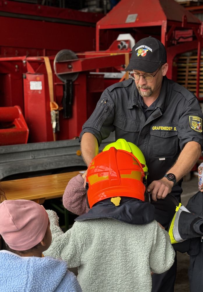 Bei der Feuerwehr Krems konnten die Kinder zwei Stationen besuchen: Bei einer Station gab es die Möglichkeit, Feuerwehrhelme und Einsatzbekleidung anzuprobieren. Dort erfuhren sie auch, wie ein Atemschutzgerät funktioniert und wie Feuerwehrleute mit diesen aussehen. Bei der zweiten Station durfte ein Blick ins Tanklöschfahrzeug nicht fehlen! Dort konnte auch mit dem Schnellangriff gespritzt werden.