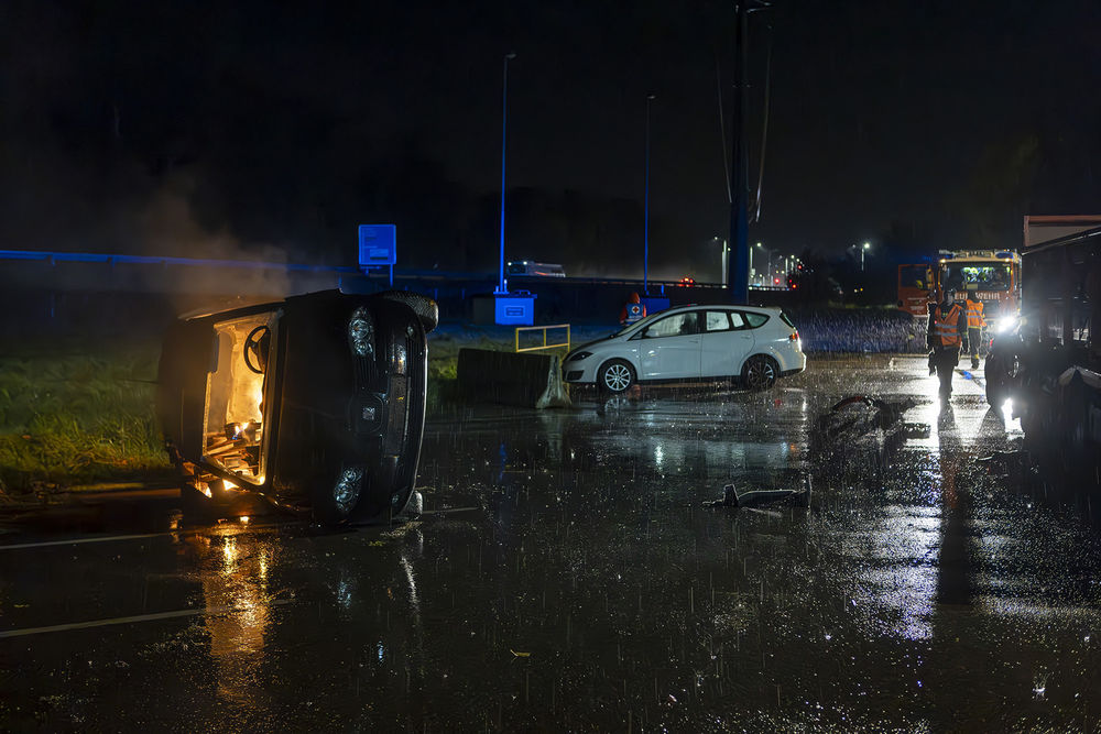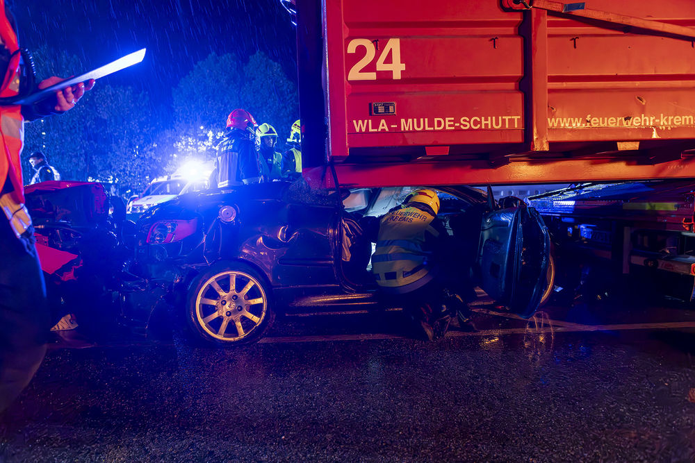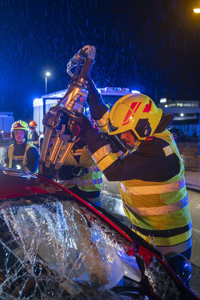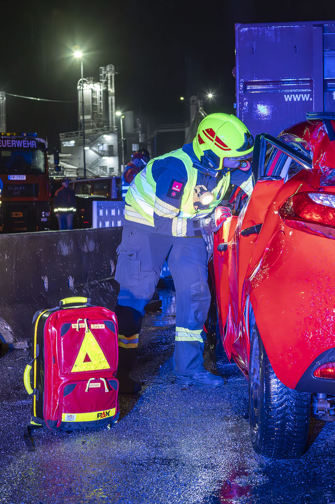 Rasch konnten die ersten Schwerverletzten aus ihren Fahrzeugen gerettet und dem Rettungsdienst übergeben werden, der die weiteren Schritte zur medizinischen Versorgung übernahm. Die Menschenrettung der Person im schwer deformierten PKW unter dem Plateau brachte die Einsatzkräfte aufgrund der engen Verhältnisse an der Betonleitwand an ihre Grenzen. Doch auch hier konnte die Person schonend aus dem Fahrzeug befreit und dem Roten Kreuz übergeben werden.