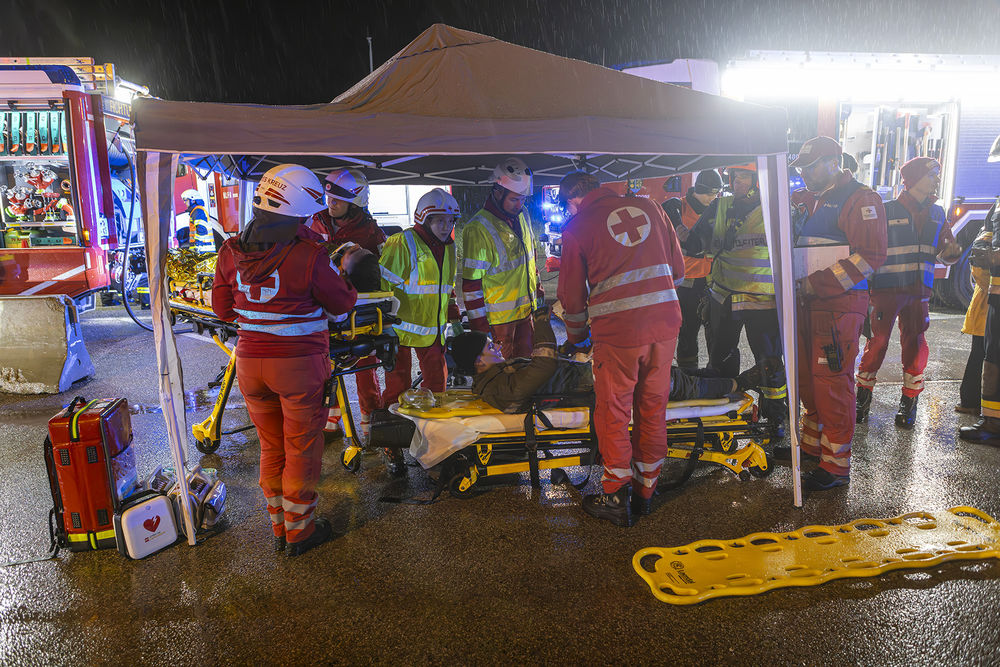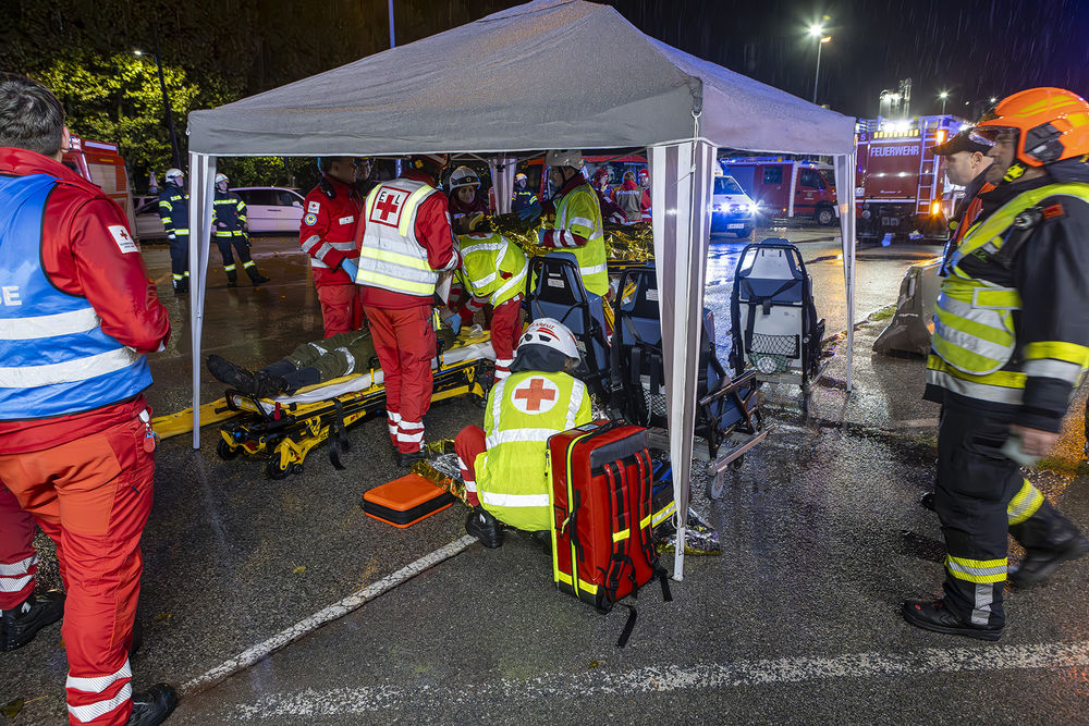 Während zahlreiche Menschenrettungen anliefen, sorgte die Feuerwehr auch für die Betreuung der Verletzten. Beim Eintreffen des Roten Kreuzes konnte auch hier der Einsatzleiter rasch eine Lageeinschätzung vornehmen. Nach Abstimmung der beiden Einsatzleiter von Feuerwehr und Rettungsdienst, wurde aufgrund der großen Menge von Verletzten nach den Grundlagen zur Bewältigung eines Großeinsatzes gearbeitet. Hierfür wurde ein Behandlungsplatz aufgebaut, das Faltzelt der Feuerwehr Gedersdorf war für die widrigsten Witterungsbedingungen ein wahrer Segen, und durch den Triage-Notarzt eine entsprechende Sichtung der Patienten durchgeführt.