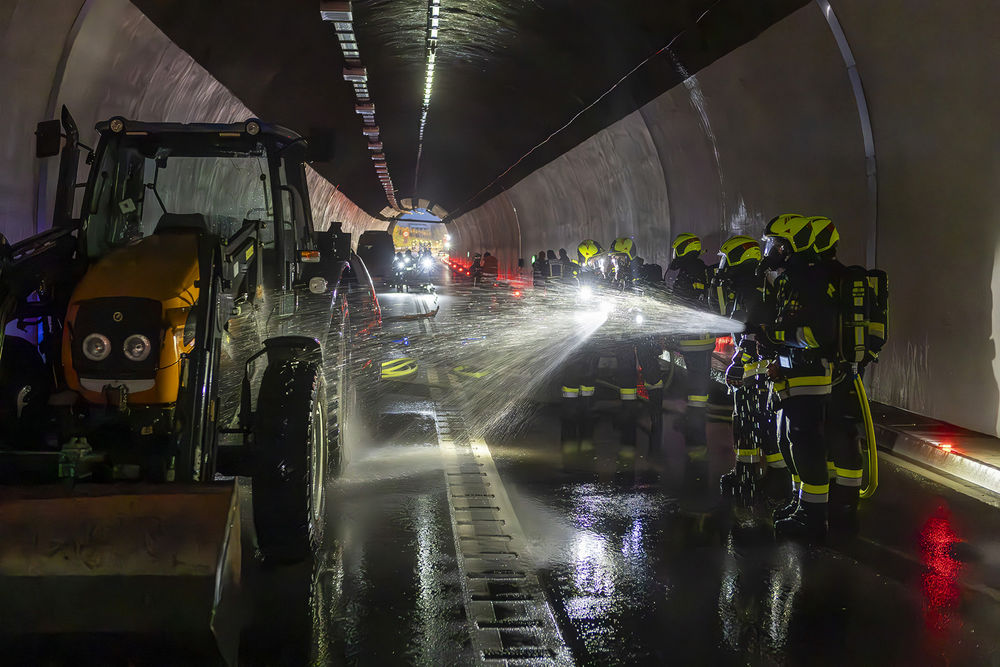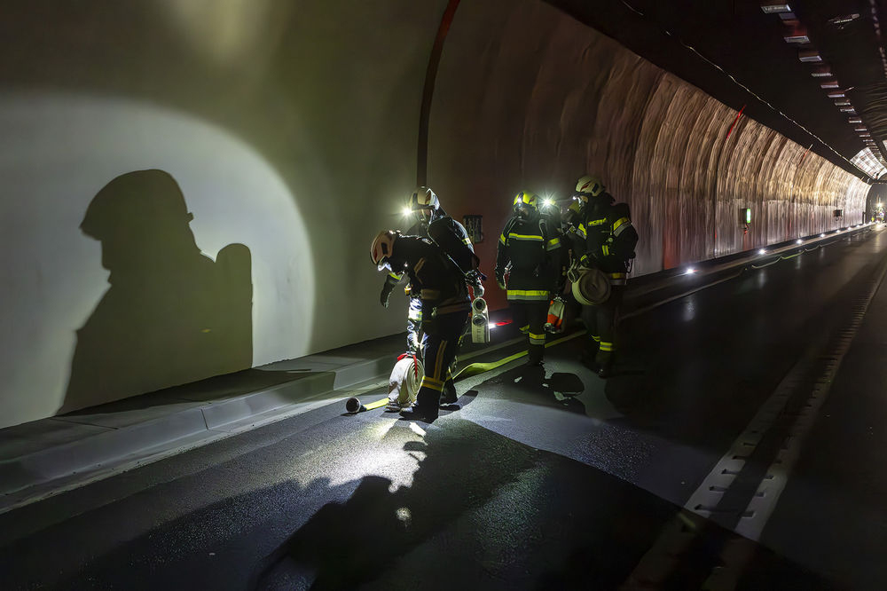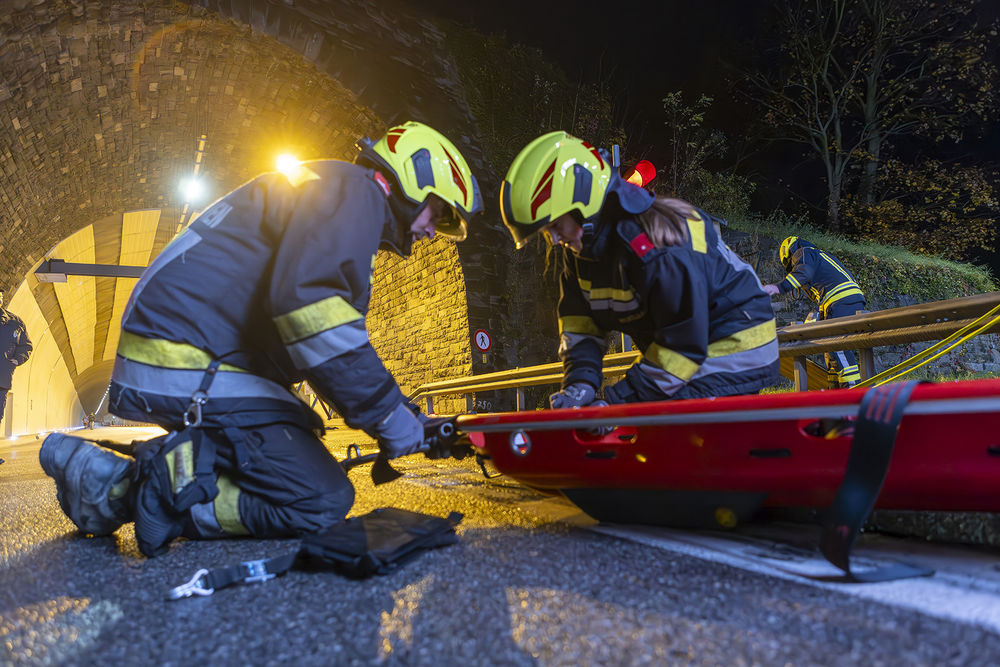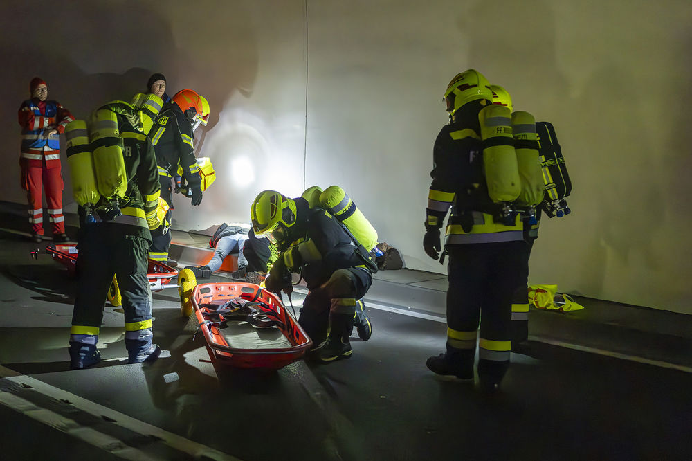"Schwerer Verkehrsunfall mit Fahrzeugbrand und Menschenrettung" - diese Lage galt es für die anrückenden Einsatzkräfte zu bewältigen. An beiden Portalen wurden Abschnittsübungsleitungen aufgebaut, wie auch im Einsatzfall geplant, um das Szenario von beiden Seiten bewältigen zu können. Schrittweise wurden die einzelnen Fahrzeuge per Funk abgerufen und die Übungsstelle kontrolliert und taktisch aufgebaut. Von beiden Portalen wurde Zubringleitungen zur Brandbekämpfung in den Tunnel unter Atemschutz gelegt. Die stationierten Twinpack-Atemschutzgeräte (2-Flaschensysteme bei Atemschutzgeräten für den Tunneleinsatz) bei den Feuerwehren Dürnstein und Weißenkirchen wurden vorbereitet und jeweils ein Tunnel-Atemschutztrupp, bestehend aus je 6 Mitglieder laut Tunneltaktik des ÖBFV (Österreichischer Bundesfeuerwehrverband) zusammengestellt. Dieser marschierte von beiden Portalen zur Brandbekämpfung und Menschenrettung in die Tunnelröhre ein und konnte den fiktiven Fahrzeugbrand erfolgreich löschen. In Zusammenarbeit mit weiteren Atemschutztrupps wurden die Verletztendarsteller, die vom Roten Kreuz Krems aufwendig realistisch geschminkt wurden, mittels Korbschleitrage gerettet.