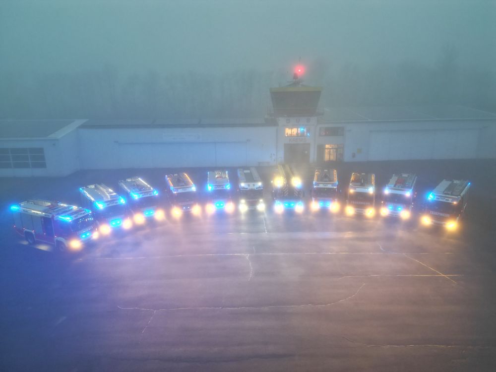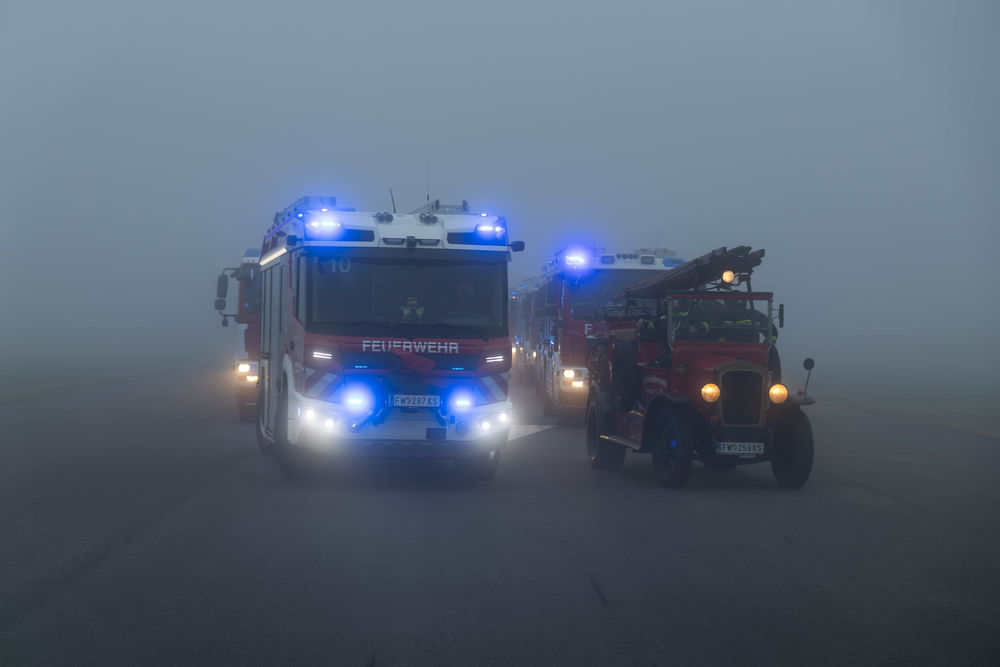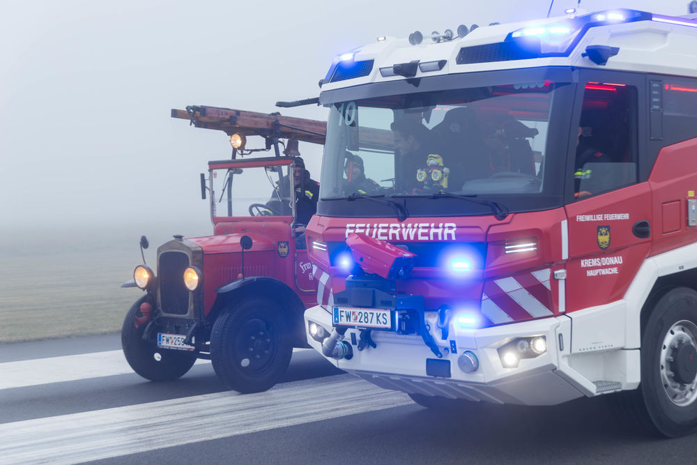 Am 30. November des vergangenen Jahres war der Flugplatz Gneixendorf wohl der sicherste Flugplatz in ganz Österreich: 13 Fahrzeuge der Feuerwehr Krems und rund 40 Mitglieder waren an diesem Tag nach Gneixendorf gekommen, um für die diesjährige Mitgliederversammlung Video- und Fotomaterial von den zehn Hilfeleistungsfahrzeugen der Feuerwehr Krems zu sammeln. Mit dem Ankauf des ersten elektrisch betriebenen HLF in Niederösterreich, welches im November in Krems eintraf und bisher zu Dutzenden Einsätzen ausrückte, stand an diesem Tag dieser im Mittelpunkt des Fotoshootings. Aber auch seine neun Geschwister und die Drehleiter waren die Stars des Tages.