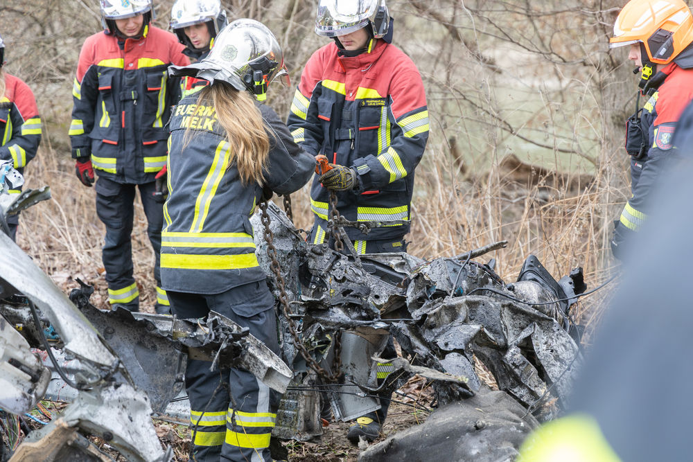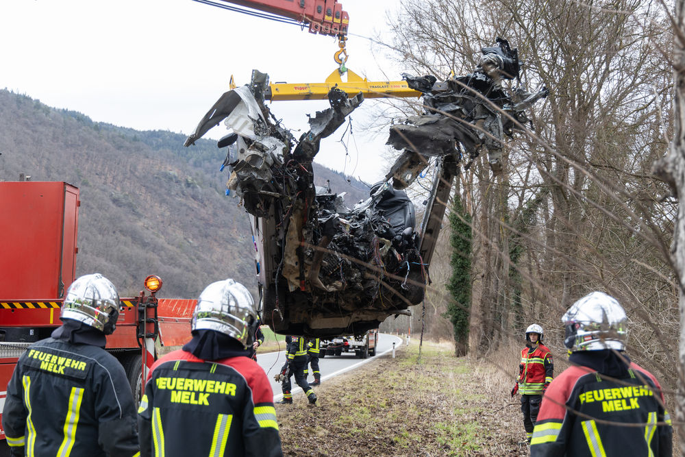Nachdem der Fahrer geborgen und dem Bestattungsunternehmen übergeben worden war, konnte die Feuerwehr Melk mit der Fahrzeugbergung beginnen. Zunächst wurde das Fahrzeug mittels der Seilwinde des Hilfeleistungsfahrzeugs der Feuerwehr Emmersdorf vom Baum weggezogen, sodass der Kran des Wechselladefahrzeugs dieses nur noch auf das Bergeplateau heben musste. Auch die herumliegenden Fahrzeugteile wurden eingesammelt und auf einen Anhänger gelegt.