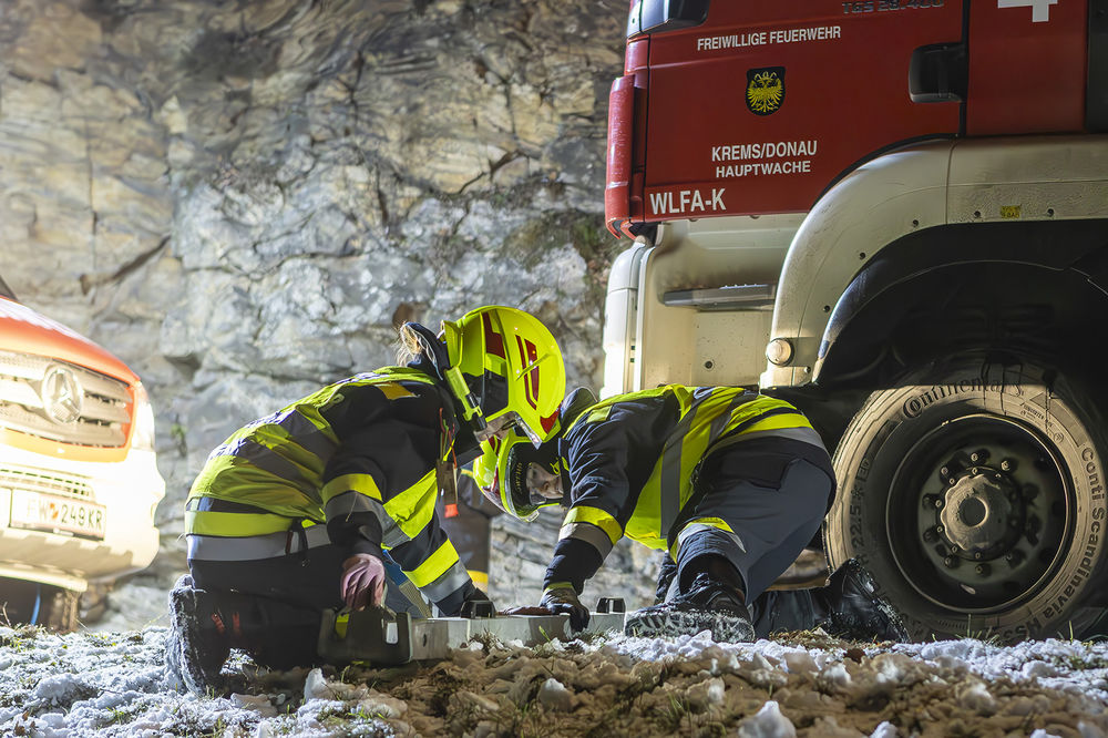 Als diese am Einsatzort eintraf, wurde zunächst die Unfallstelle abgesichert. Zur Bergung des verunfallten Fahrzeuges wurde die Feuerwehr Krems mit ihrem Wechselladefahrzeug mit Kran nachalarmiert, welches kurze Zeit später ausrückte.