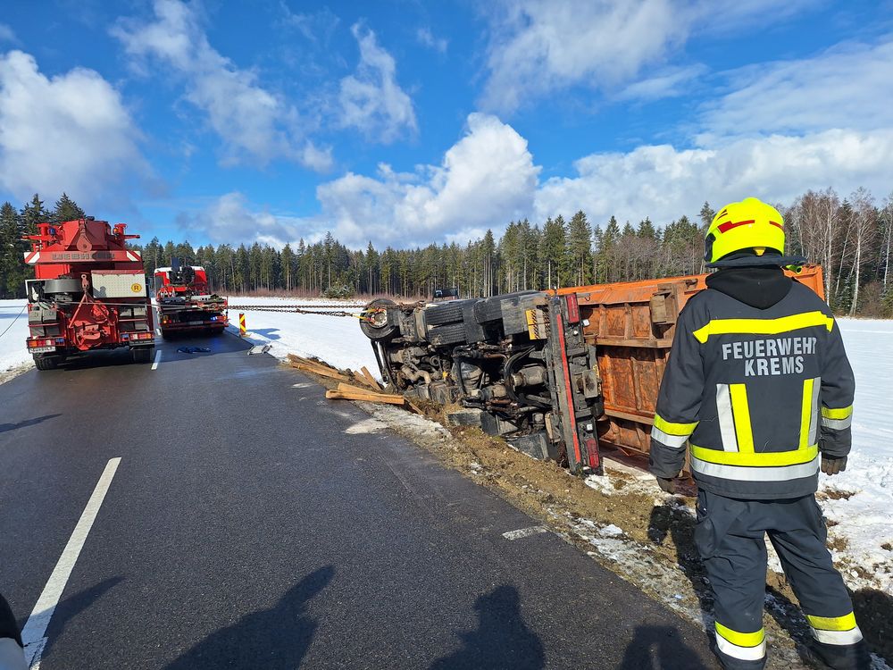 Bereits beim Eintreffen der Feuerwehr konnte festgestellt werden, dass die Fahrzeuginsassen die Fahrzeuge selbstständig verlassen konnten. Während die Bergung des PKWs durch die Feuerwehr Heidenreichstein durchgeführt wurde, forderte der Einsatzleiter die Feuerwehr Krems mit dem Kranfahrzeug nach, um den im Straßengraben liegenden LKW zu bergen.