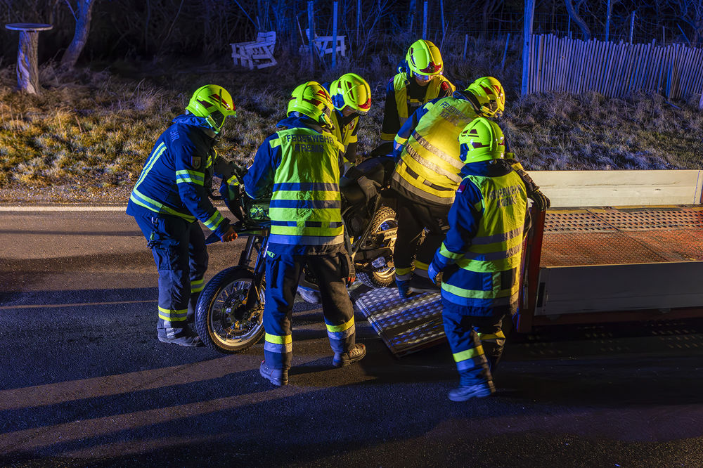 Die Aufgabe der Feuerwehr bestand darin, die Unfallstelle abzusichern und die Kraftfahrzeuge von der Unfallstelle zu verbringen. Mittels Last 4 wurden die Fahrzeuge sukzessive zu einem gesicherten Abstellplatz transportiert. Beim Unfall wurde der Tank des Motorrads beschädigt und es traten Betriebsmittel aus. Diese wurden durch die Feuerwehr gebunden und im Anschluss die Fahrbahn gereinigt.