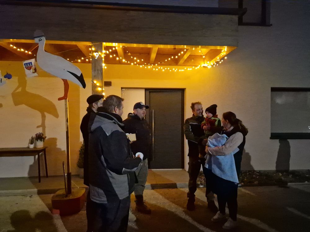 Christoph Gruber, Kommandant-Stellvertreter der Hauptwache, sowie das Zugskommando des 2. Zuges, allen voran Patrik Leopold, überreichten den Eltern das vorbereitete Geschenk und gratulierten ihnen herzlich. Anschließend stellten die Kameraden den Storch der Hauptwache auf.