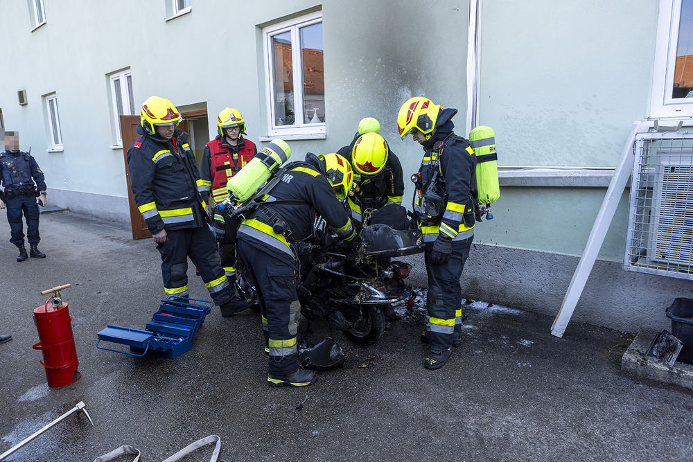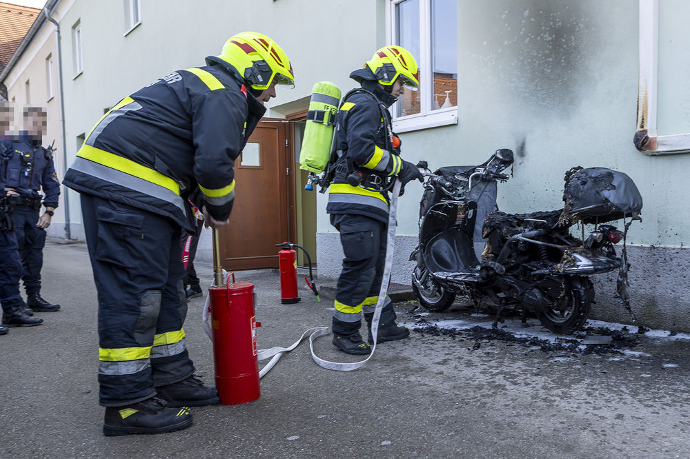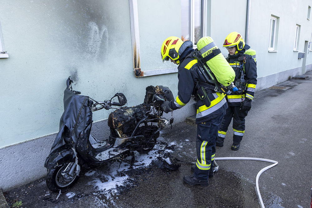 Beim Eintreffen der Feuerwehr wurde ein Moped vorgefunden, das bereits abgelöscht war. Anrainer bemerkten das Feuer und reagierten vorbildlich: Sie nahmen einen Feuerlöscher zur Hand und löschten den Brand. Durch dieses Handeln konnte ein Übergreifen auf das angrenzende Wohngebäude verhindert werden.