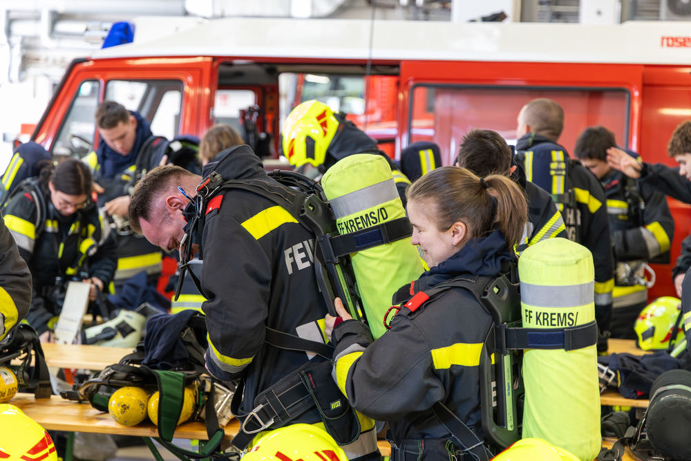 Danach besuchen die Teilnehmer ein Modul im Bezirk (AT20 - Modul Atemschutzgeräteträger), in diesem Fall bei der Feuerwehr Krems. In diesem Ausbildungsmodul vertiefen die Teilnehmenden den Umgang mit umluftunabhängigen Atemschutzgeräten. Zudem lernen sie die wichtigsten Verhaltensregeln für den Atemschutzeinsatz kennen und setzen diese in praxisnahen Übungen um.