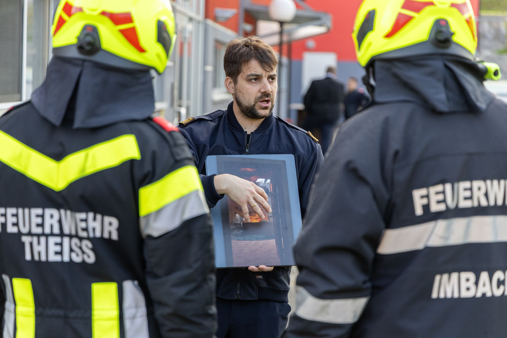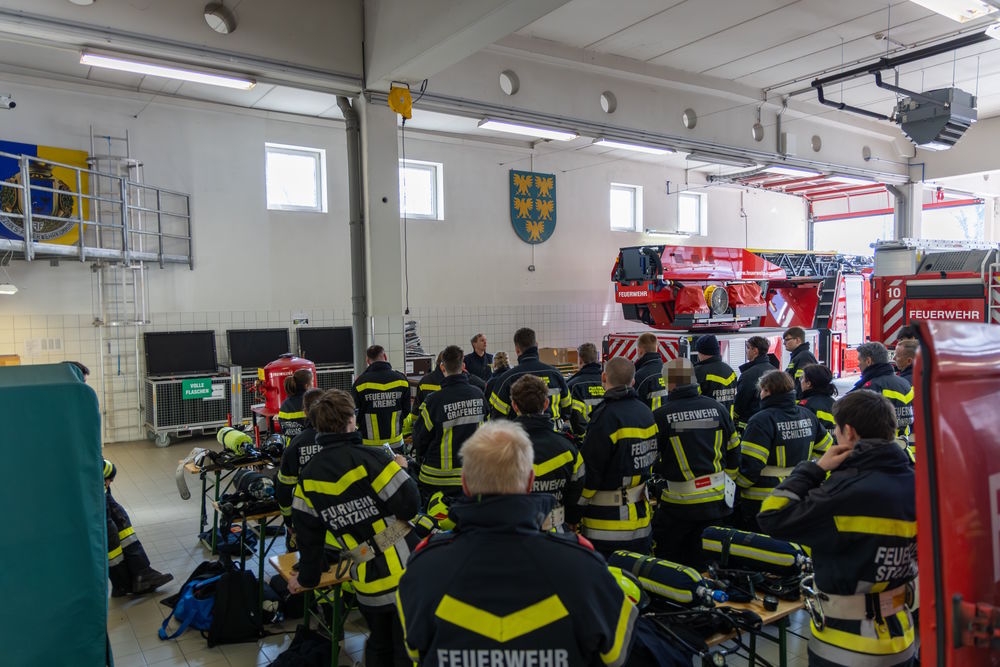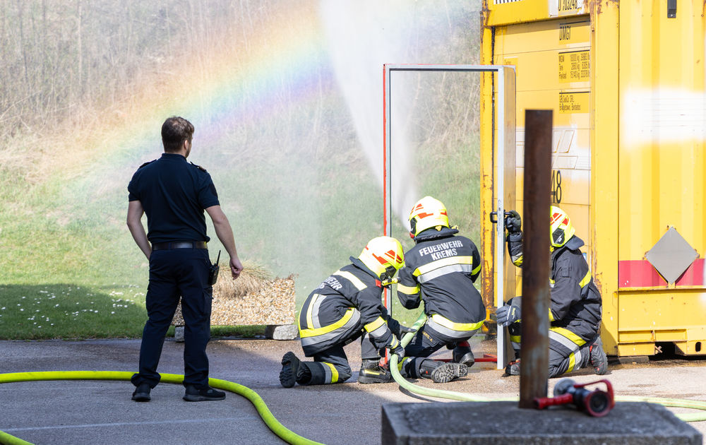 Bei einer weiteren Station besprechen die Einsatzkräfte verschiedene Vorgehensweisen mit dem Strahlrohr und setzen diese anschließend praktisch um. Zudem trainieren sie das richtige Öffnen einer Tür, hinter der sich möglicherweise ein Brand befindet.