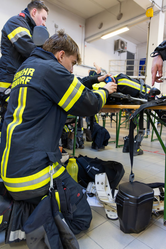 Es fanden 2 Module Anfang und Mitte März in zwei Blöcken jeweils am Freitag und Samstag ganztägig statt. Beide Tage beginnen mit einem Theorieblock in den Morgenstunden. Im Anschluss folgt jeweils ein praxisintensiver Ausbildungsteil. Ziel des ersten Tages ist es, den Teilnehmenden folgende Inhalte zu vermitteln: Einsatzgrundsätze und Verhalten in Notsituationen sowie Fortbewegungsarten und Menschenrettung beziehungsweise Rettungstechniken. Beim Thema „Einsatzgrundsätze und Verhalten in Notfällen“ stehen mehrere Ausbildungsziele im Mittelpunkt: die Aufgabenverteilung innerhalb des Trupps, die Definition der Gefahrengrenze, die Erklärung und Erläuterung des Atemschutzsammelplatzes, das richtige Verhalten in Notsituationen sowie der Umgang mit kontaminierter Atemschutzausrüstung.