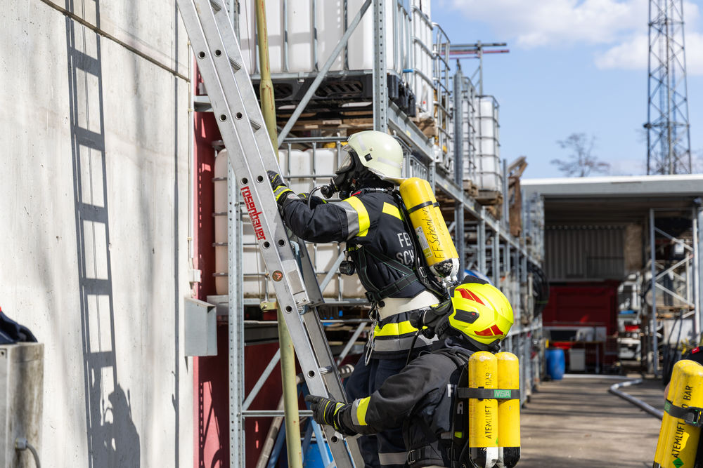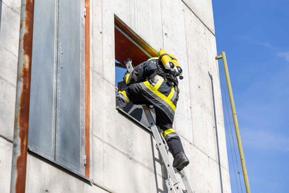 Am zweiten Tag folgt nach dem theoretischen Vortrag im Lehrsaal erneut der praktische Teil. Dafür teilt sich die Gruppe auf vier Stationen auf. An einer Station absolvieren die Auszubildenden eine Übungsstrecke, die durch starke Verrauchung zusätzlich erschwert wird. Dabei achten die Ausbilder besonders auf die Kommunikation sowie die gegenseitige Unterstützung innerhalb des Trupps. Eine weitere Station umfasst die Suchtechnik mit Menschenrettung. Ziel dieser Übung ist das praktische Anwenden der sogenannten Wandtechnik. Ein weiterer Teil der Ausbildung behandelt den Einsatz mit Leitern. Die Mitglieder üben dabei das Besteigen einer Leiter mit Atemschutzgerät. Zusätzlich trainieren sie das richtige Einsteigen über ein Fenster in einen Raum. Auch das Aufziehen einer Löschleitung sowie die Selbstrettung über eine Leiter stehen auf dem Ausbildungsprogramm.