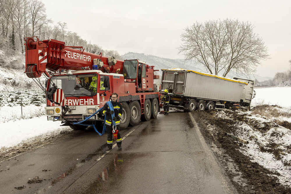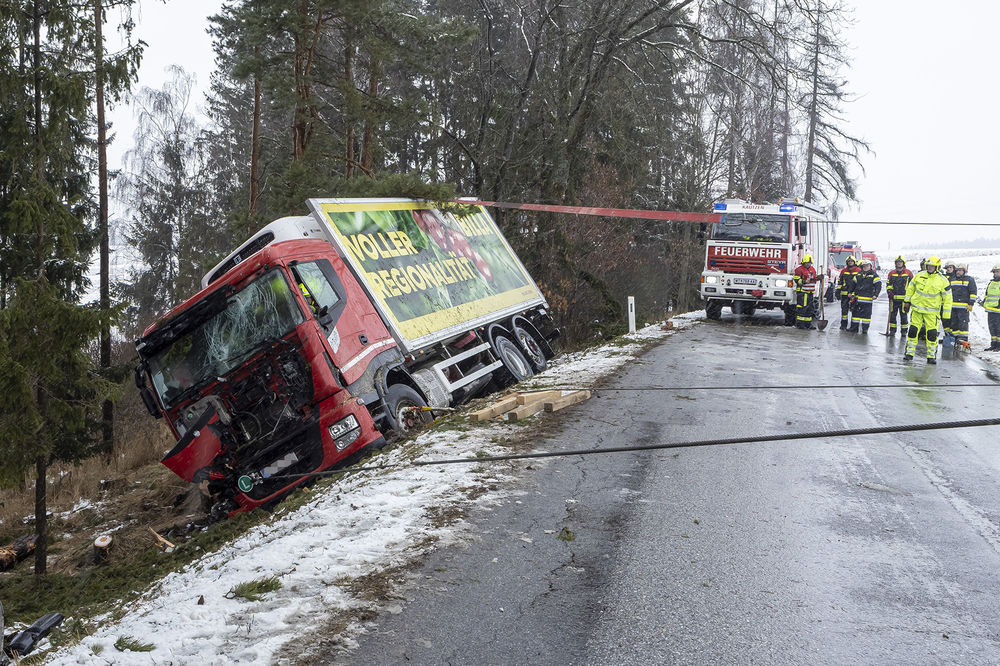 Freitag, 30. Jänner 2026 LKW Bergung nach Verkehrsunfall in Gastern (WT) Zu einem Verkehrsunfall mit eingeklemmter Person wurden am Donnersfrüh drei Feuerwehren des Bezirkes Waidhofen an der Thaya alarmiert. Ein Lkw kam in einer abschüssigen Linkskurve rechts von der Fahrbahn ab, fällte zwei Bäume und kam in einer gefährlichen Schräglage zum Stillstand. Mehrere Bäume verhinderten einen weiteren Absturz des Schwerfahrzeuges. |