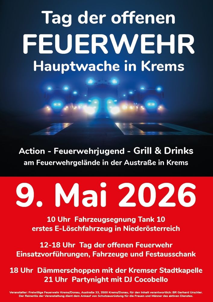 Samstag, 9. Mai 2026 Hauptwache: Tag der offenen Feuerwehr Die Tore werden geöffnet – die Hauptwache der Feuerwehr Krems veranstaltet am 9. Mai ihren ersten Tag der offenen Tür mit anschließendem Dämmerschoppen. Die Besucher erwartet ein eindrucksvolles und abwechslungsreiches Programm in der größten Feuerwache Österreichs. |